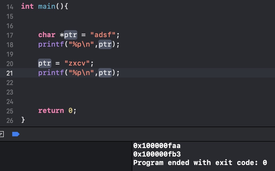포인터에 문자열을 대입하여 초기화하고 포인터가 가리키는 주소값을 출력 후 다시 다른 문자열을 대입한 후 포인터가 가리키는 주소값을 출력하였을 때 다른 주소가 출력되는 것을 확인할 수 있습니다.