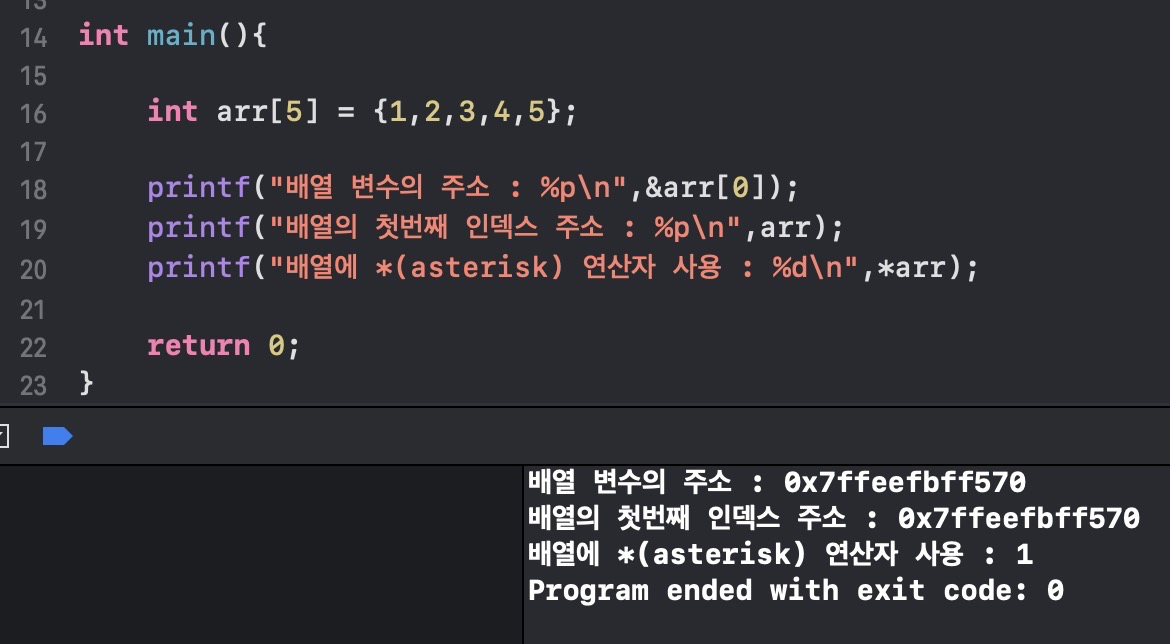 위 사진처럼 배열 변수 이름의 주소와 배열의 첫번째 인덱스의 주소는 동일합니다. 또한 배열 변수에 *(asterisk) 연산자를 사용해서 연산하였을 때 배열의 첫번째 인덱스의 요소가 출력됩니다.!! 즉, 배열은 포인터처럼 사용할 수 있고 포인터는 배열처럼 사용할 수 있습니다.