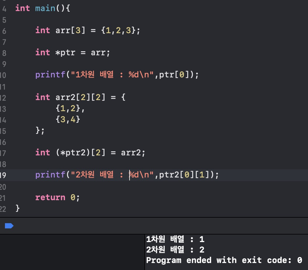 배열 포인터는 배열을 담을 수 있는 포인터입니다. 설명으로는 이해가 어려우니 소스코드로 보여드리겠습니다.