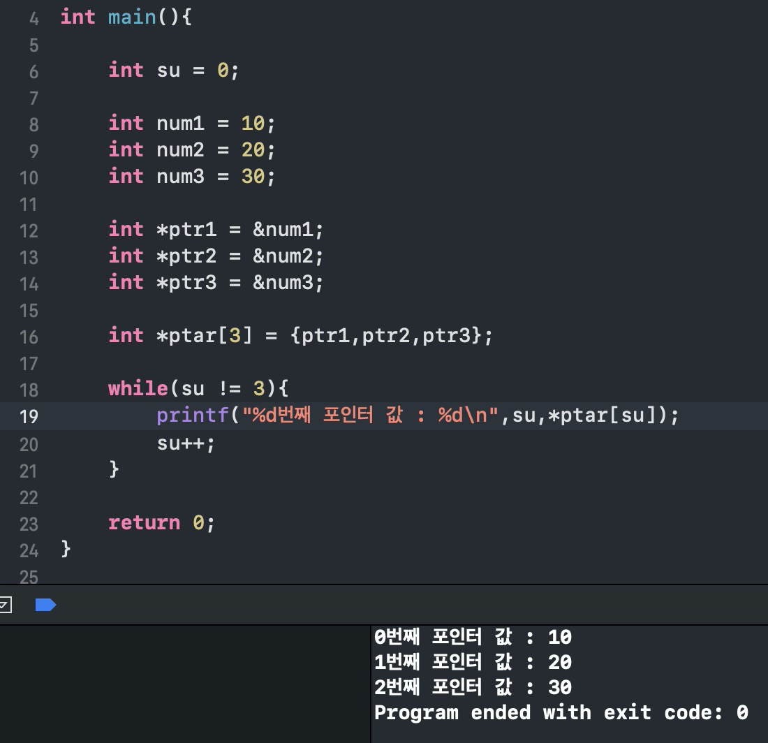이처럼 포인터들을 배열에 담아서 관리를 할 수 있습니다.!! 포인터 배열은 포인터배열 자체를 함수의 인자로 전달하여 다른 함수에서 배열 요소들의 주소로 접근하여 컨트롤이 가능합니다.