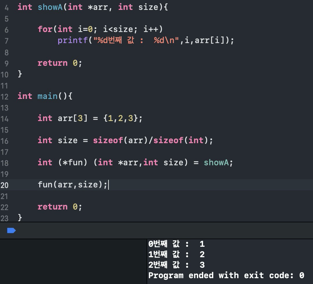 이렇게 함수의 이름을 포인터 함수에 대입하여 초기화한 후 포인터 함수를 이용해서 대입한 함수의 기능을 사용할 수 있습니다.