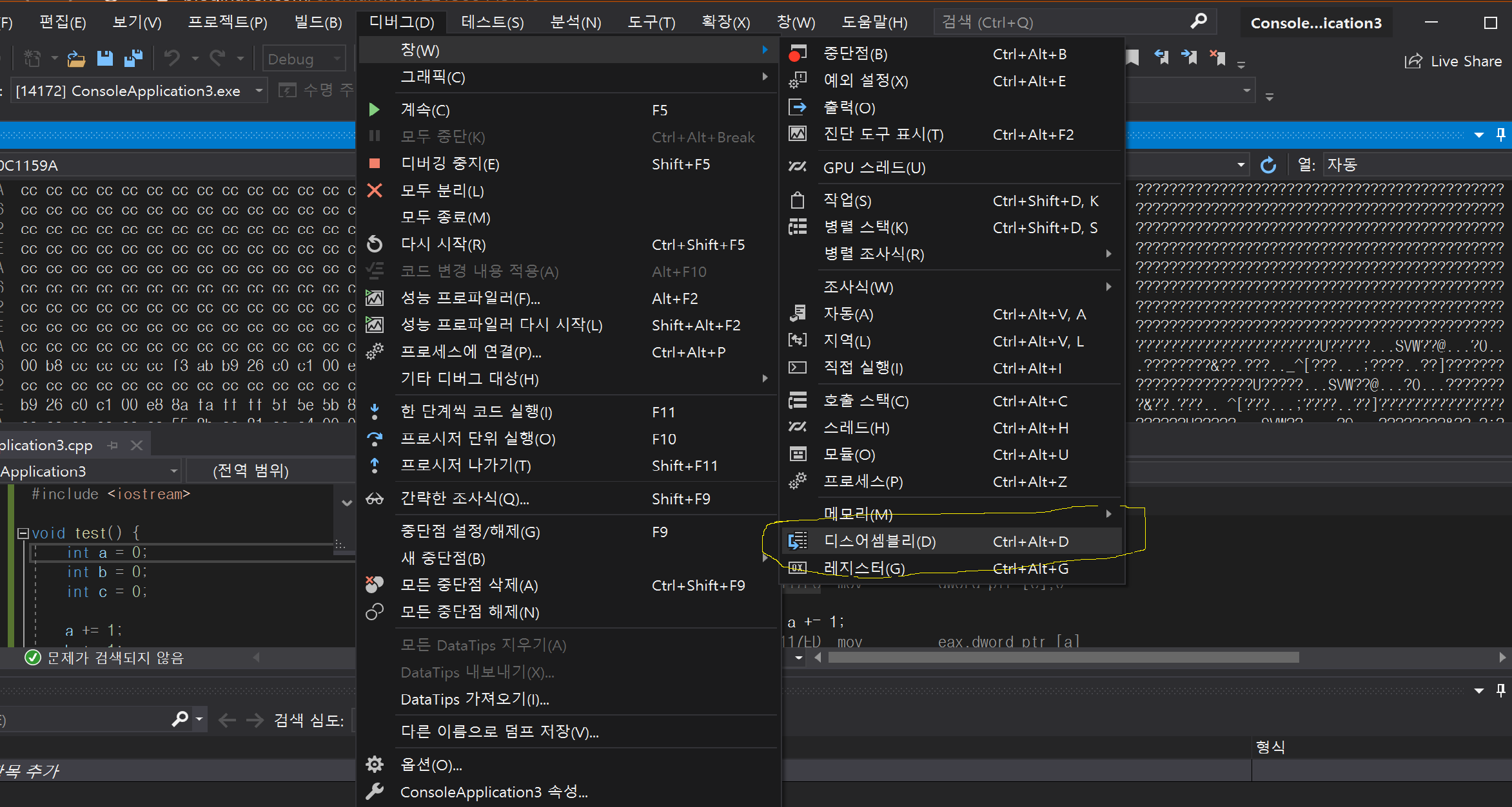위 사진처럼 디스어셈블리를 선택하여 어셈블리어를 확인할 수 있습니다.