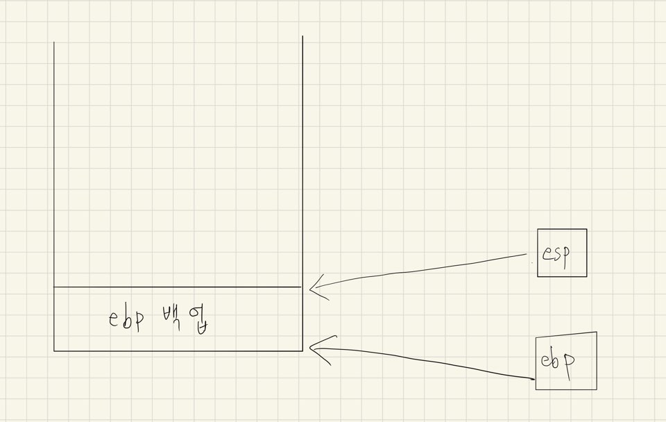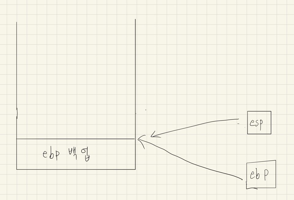 그리고 esp가 가리키는 메모리 위치를 ebp에 복사합니다. esb가 가리키는 위치는 아래 사진처럼 변경됩니다.