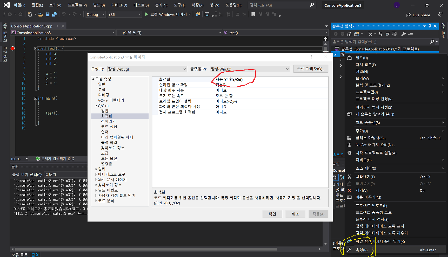 먼저 프로젝트 속성에서 C/C++ 메뉴를 클릭 후 최적화 메뉴에서 "사용 안 함"을 체크를 해주세요.