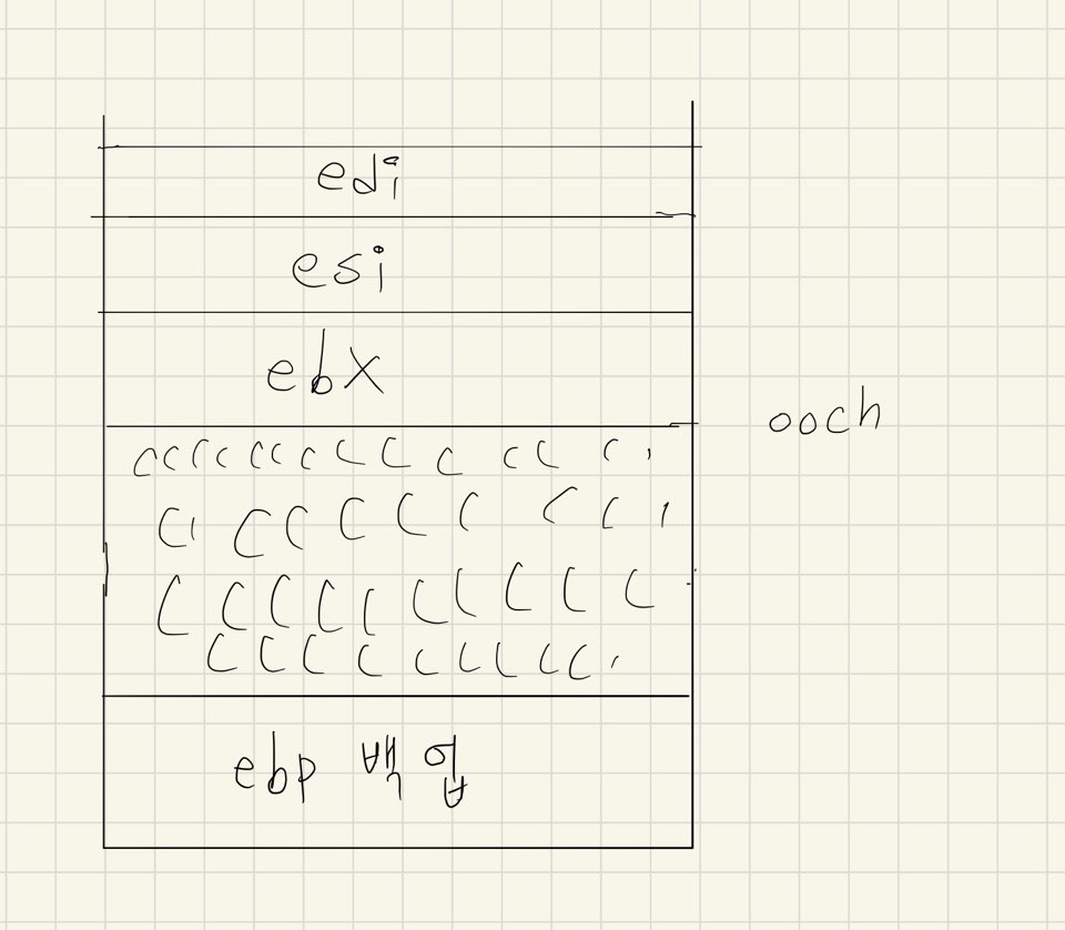 그리고 0cccccccch로 확보된 부분은 예제로 작성된 코드를 볼 경우 겨우 3개의 int형 변수를 사용하지만 너무 많은 공간이 확보되었습니다.