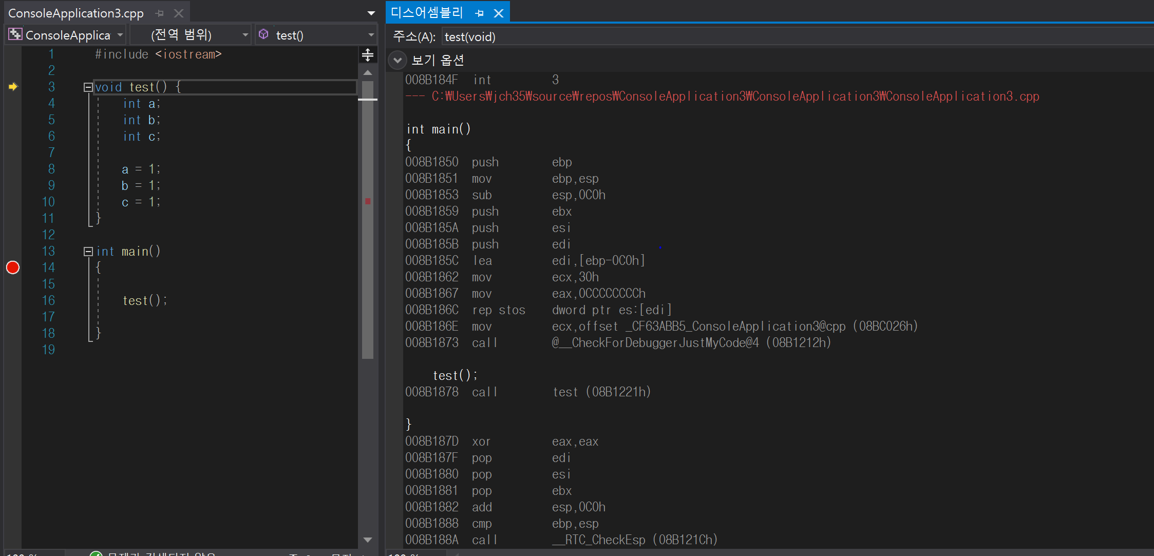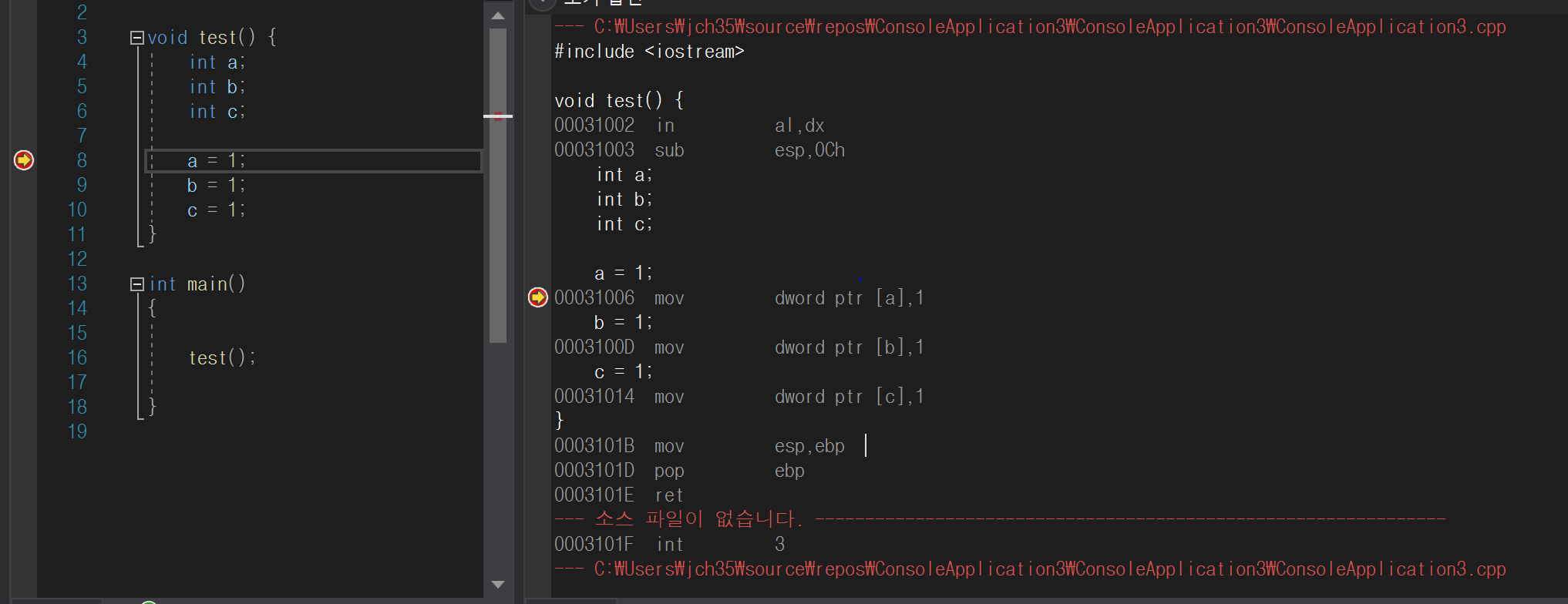 그림에 있는 간단한 소스코드를 체크포인트를 이용하여 Debug모드 컴파일 후 디스어셈블을 창을 열어보았습니다.