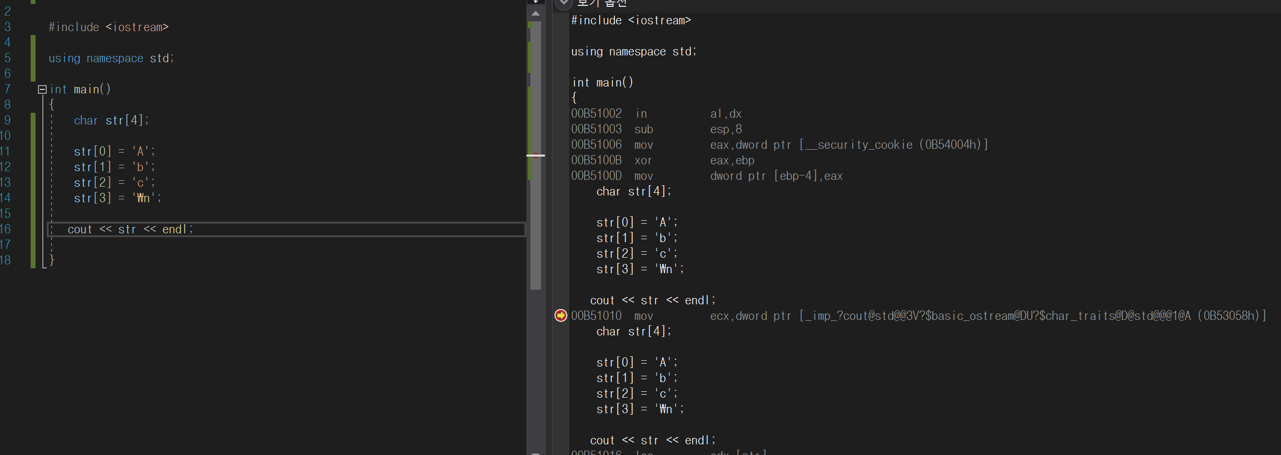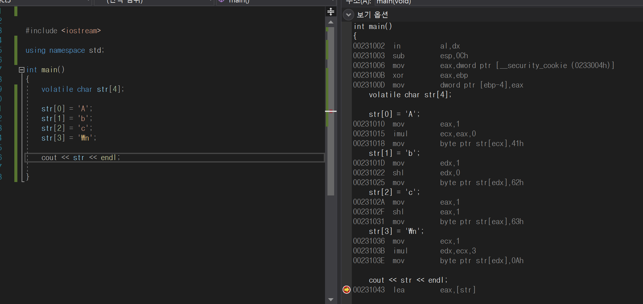 오른쪽 어셈블리어를 확인해보면 한줄 한줄 코드가 해석되어 어셈블리어 코드로 변환된 모습입니다.
