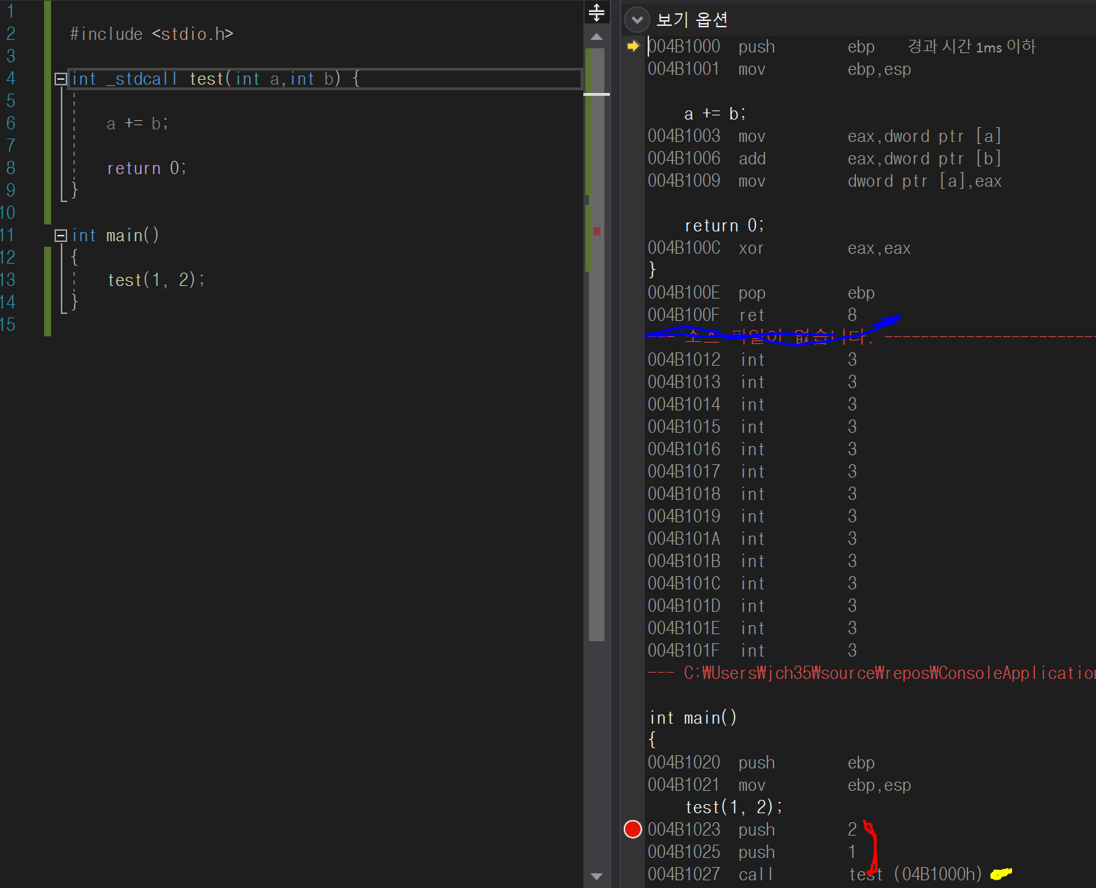 ※ 파랑색 표시는 callee 즉, test 함수내에서 스택프레임이 해제되는 어셈블리 코드입니다.