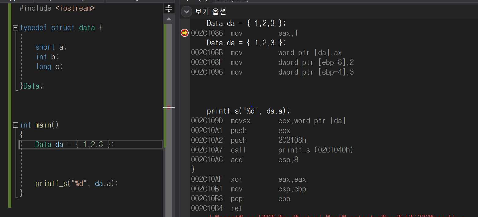 먼저 구조체 Data a;를 1,2,3 순서로 초기화하는 코드를 보시고 디스어셈블러의 코드를 살펴보시길 바랍니다.