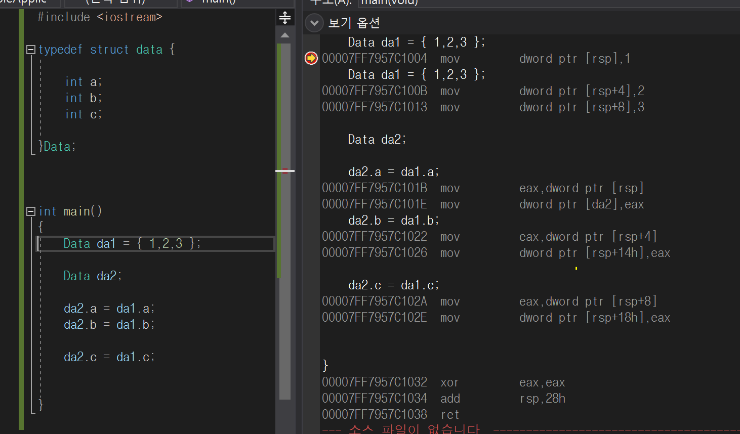 작성한 소스코드와 디스어셈블러로 확인해보도록 하겠습니다.