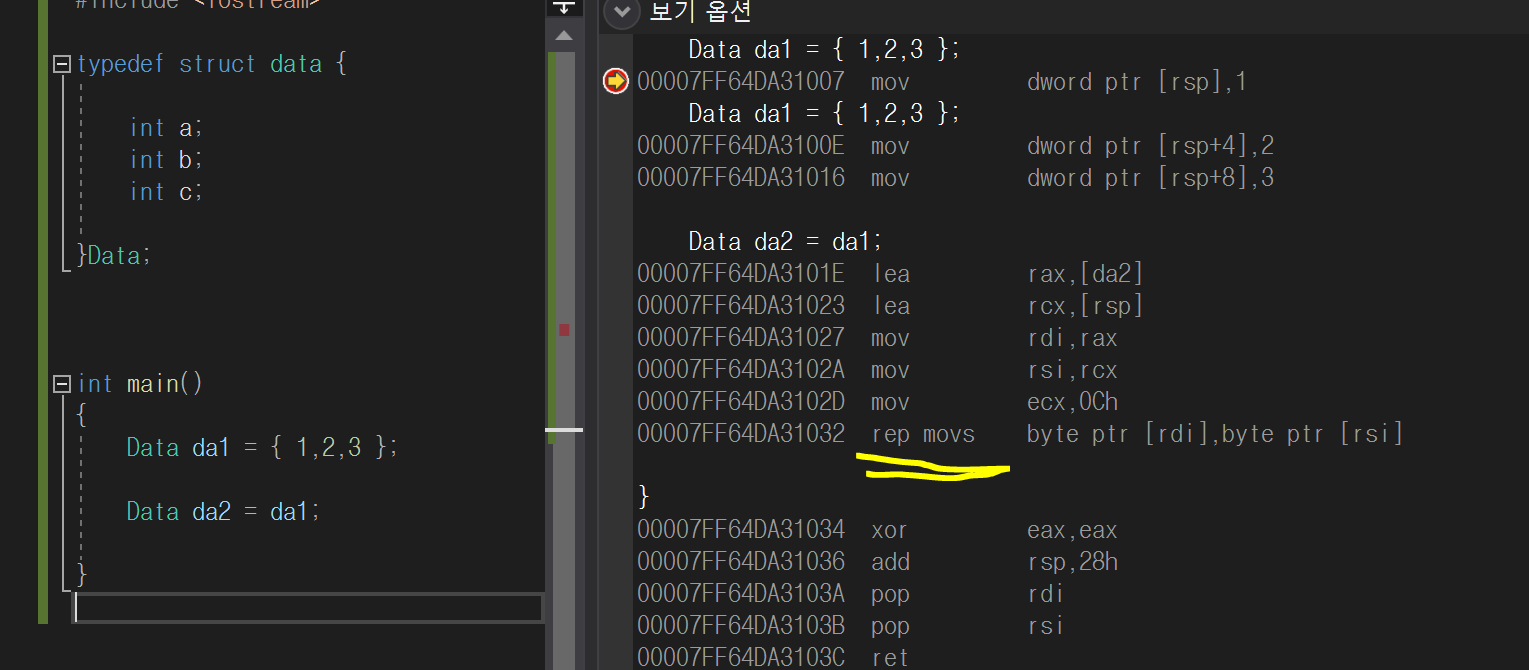구조체의 복사는 32bit 환경과 64bit 환경에 따라서 어셈블리 코드가 변경됩니다.