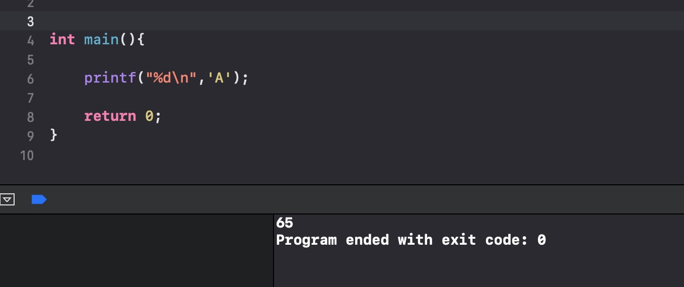 사진을 보시게 되면은 대문자 A를 정수형 서식지정자를 통해 출력된 것을 볼수 있을것입니다.