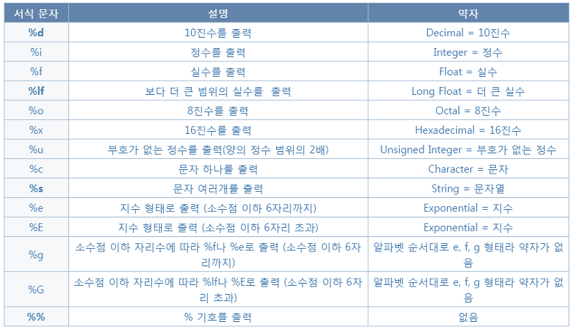 printf()는 문자열을 출력하거나 서식문자를 통해서 여러가지 원하는 값을 출력할 수 있습니다.