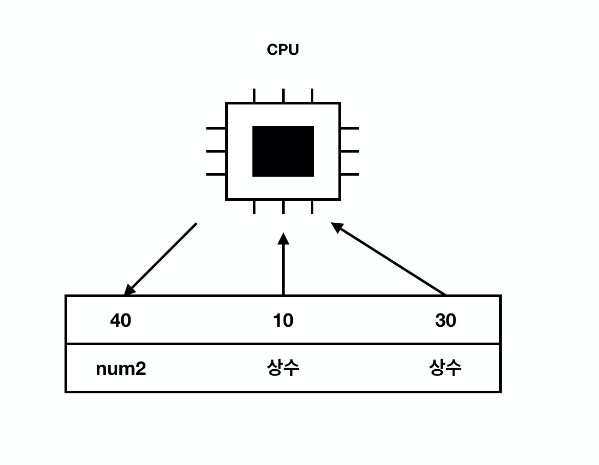 위 사진을 보시게되면은 먼저 입력한 10과 30을 메모리에 저장하여 그것을 CPU를 통해 연산 후 num2 변수에 대입을 하고있습니다.